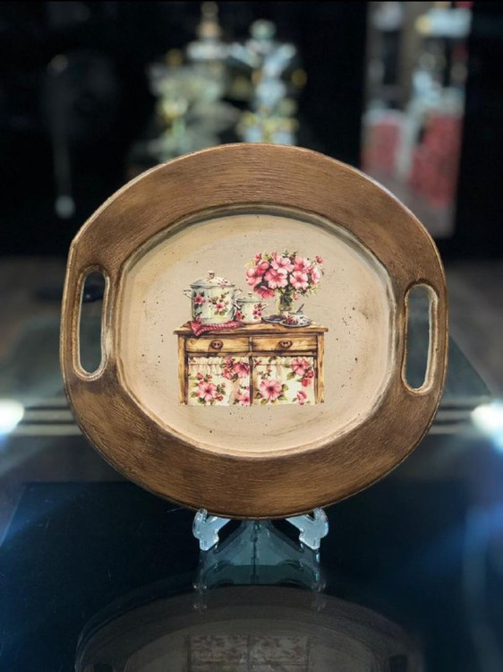 یک محصول شیک و کاربردی که هم برای پذیرایی و هم به عنوان المان دکور روی میز یا اپن آشپزخانه مناسب است. این سینی با کار دست، پتینه کاری ظریف و حاشیه چوبی با خطوط طبیعی، جلوهای کلاسیک و هنری به فضای شما میدهد.