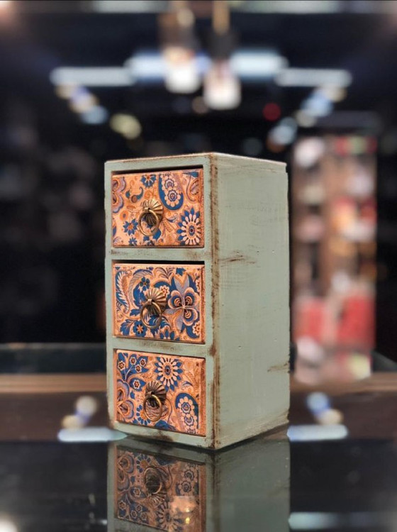 این سهکشو با رنگ فیروزهای دلنشین و دربهای طرح سنتی پتینه کاری شده، هم برای نگهداری وسایل ریز و دوستداشتنی عالیه و هم مثل یه تابلوی هنری، خونهتون رو قشنگتر میکنه.