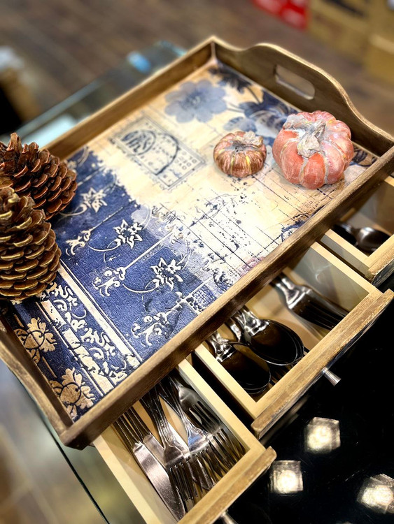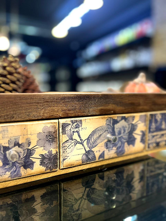یک محصول خاص که هم جادار و کاربردیه و هم مثل یک قطعه هنری چشمگیر، فضای آشپزخانه یا پذیرایی شما رو زیباتر میکنه. این باکس تمامچوب با سه کشوی کاربردی و سطحی مزین به طرحهای کلاسیک آبی–طلایی، انتخابی بینظیره برای خانمهایی که هم نظم و کارایی رو میخوان و هم زیبایی و دکوراسیون براشون مهمه.