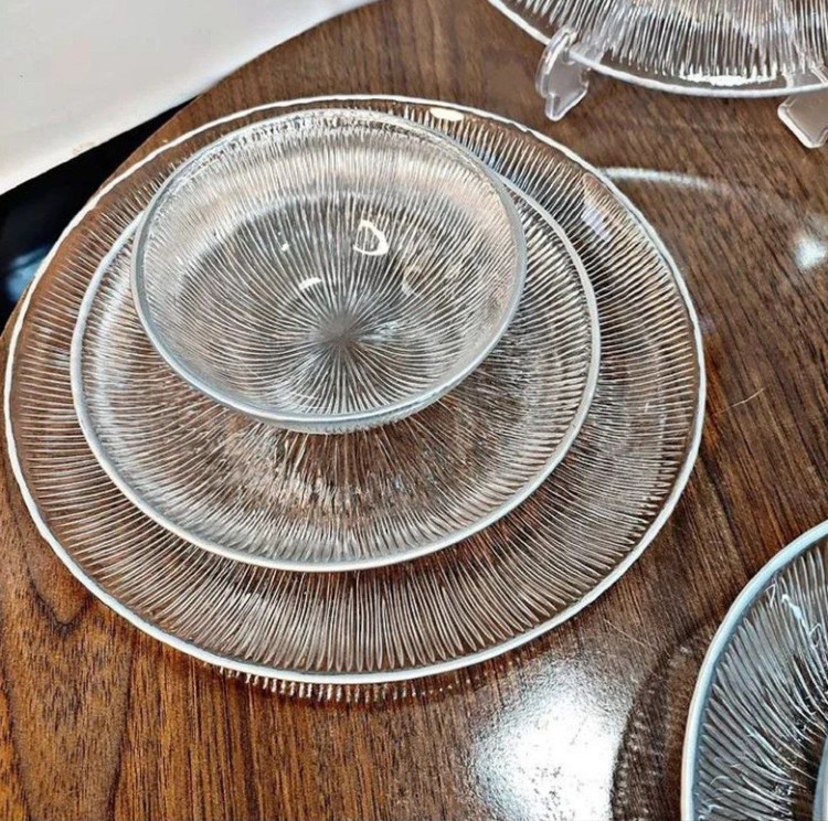 جنس شیشهای شفاف با درخشش ملایم پلاتین، حس پاکی، نظم و اصالت را در فضا پخش میکند و با هر رنگ رومیزی یا دکور هماهنگ میشود.