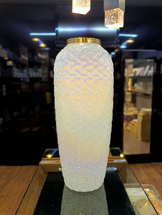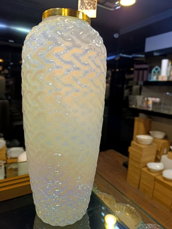 طراحی برجسته و بافت خاص بدنه در کنار جلوهی هفترنگ (ایریدهسنت) باعث میشود در هر زاویه نور، طیفی زیبا و متفاوت دیده شود؛ از سفید صدفی ملایم تا انعکاسهای رنگینکمانی ظریف که حس لاکچری و مدرن به فضا میدهد.