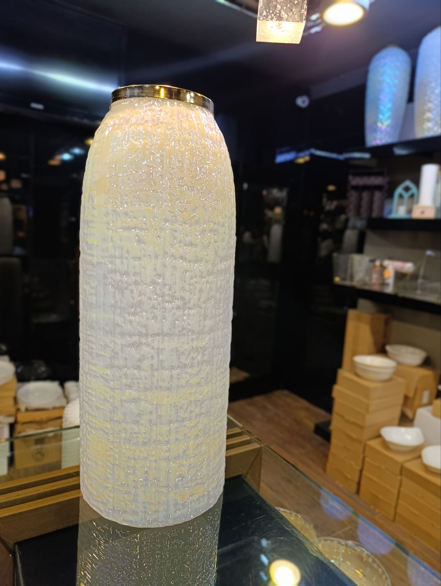 بافت برجسته بدنه در کنار درب طلایی براق، ترکیبی چشمنواز ساخته که حتی بدون گل هم بهتنهایی یک نقطه کانونی در سالن یا دفتر کار شما خواهد بود.